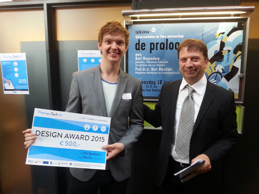I participated in TherapyTech during my graduation semester. During this event researchers, companies and therapist try to find an answer on how to use technology for therapy purposes. I was asked to showcase my graduation project BackUp at this exhibition and gave live demos of the system. I also participated in the design challenge. With BackUp I won the TherapyTech design award 2015. The feedback from the jury was that BackUp feels like a finished product, which is ready for market. The aesthetics are great and the function and need for this from the field is really apparent.